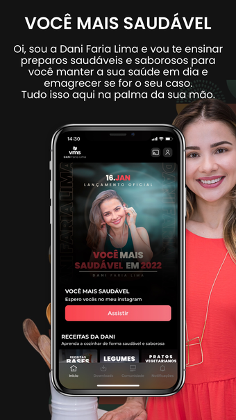 健康的なライフスタイルを促進することを目的としたiPhoneアプリケーション、Você Mais Saudável - VMSは、ヘルシーシェフのダニ・ファリア・リマによってガイドされています。このアプリは、栄養士ジェシカ・フラガCRNIによってキュレーションされた栄養指導を提供しています。Deepak Chopra、David Perlmutter、Sophie Deram、Gabriela Barreto、およびGyorgy Scrinisなどの信頼性の高い情報源に基づいて、ユーザーがより健康的な習慣を身につけるのを支援することを目指しています。